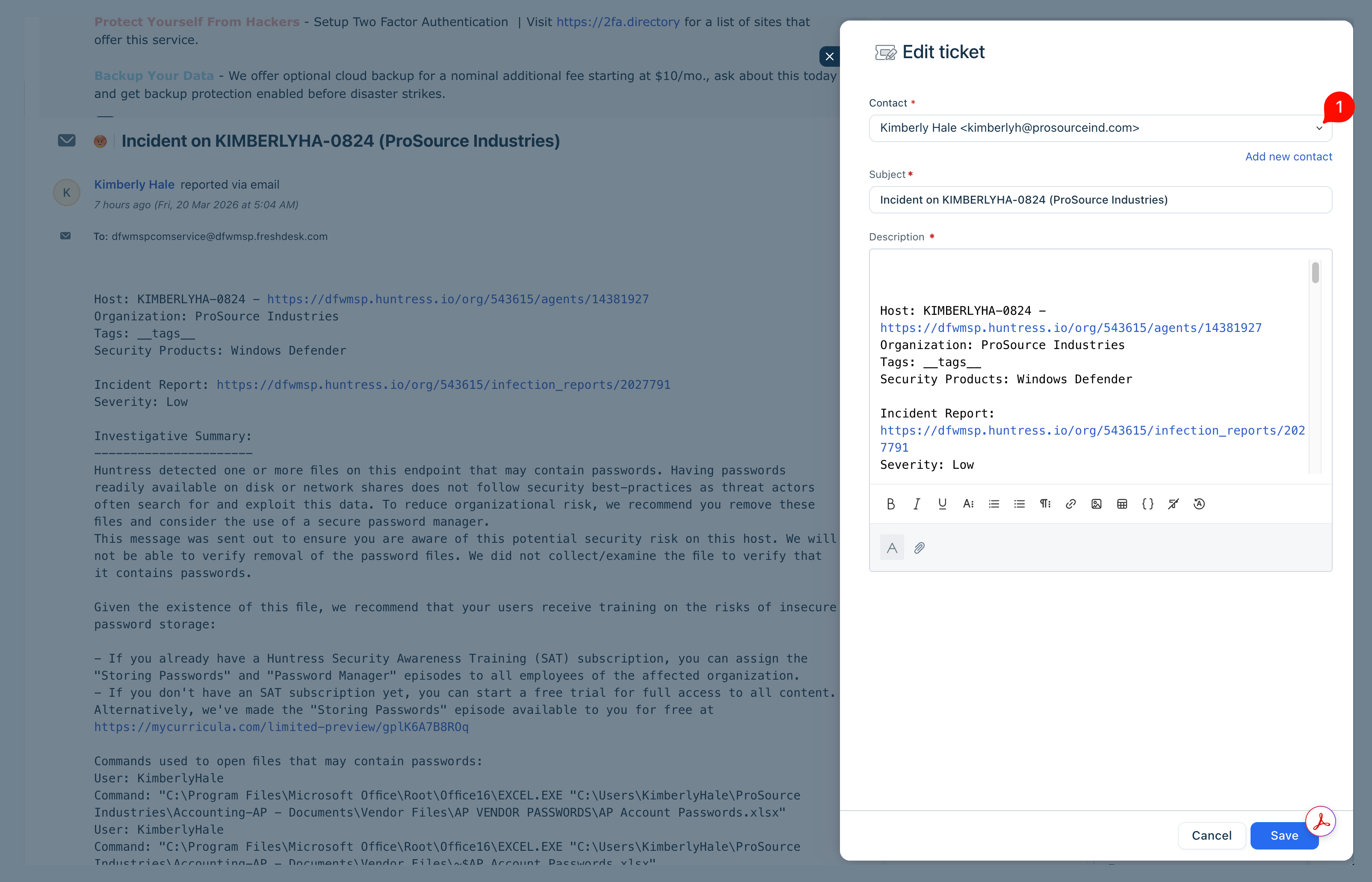 Update the ticket contact from Huntress Security to the affected end user. This ensures your reply is delivered to the user rather than the unmonitored Huntress notification address.