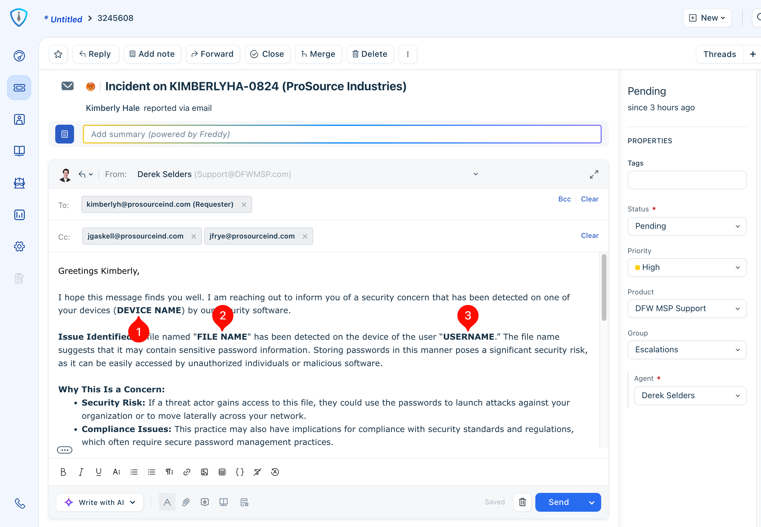 Once all appropriate contacts are confirmed and included, review the full response for accuracy, clarity, and typos. Send the reply and set the ticket status to Pending.