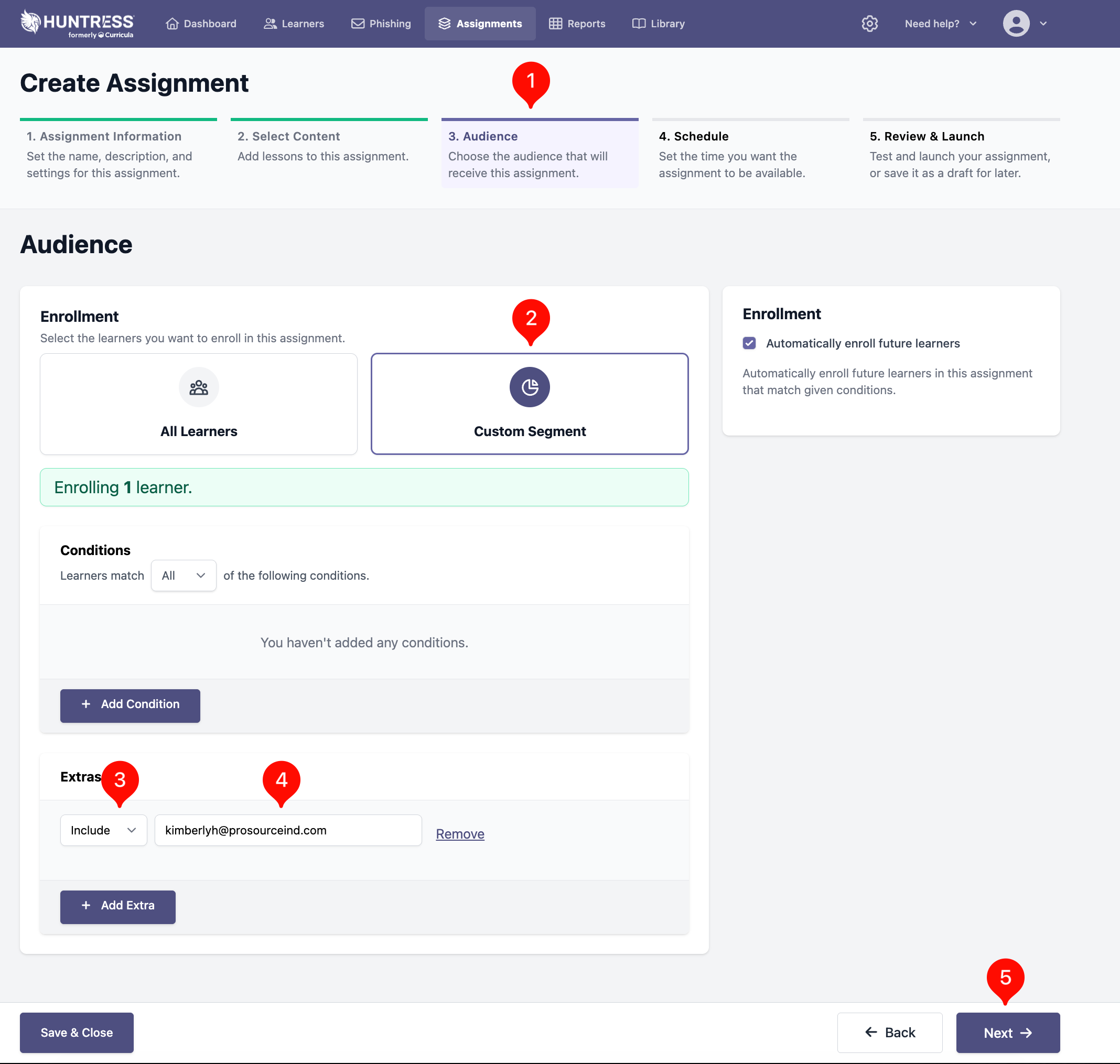 In Audience, select Custom Segment, then under Extras include the affected user. Click Next.