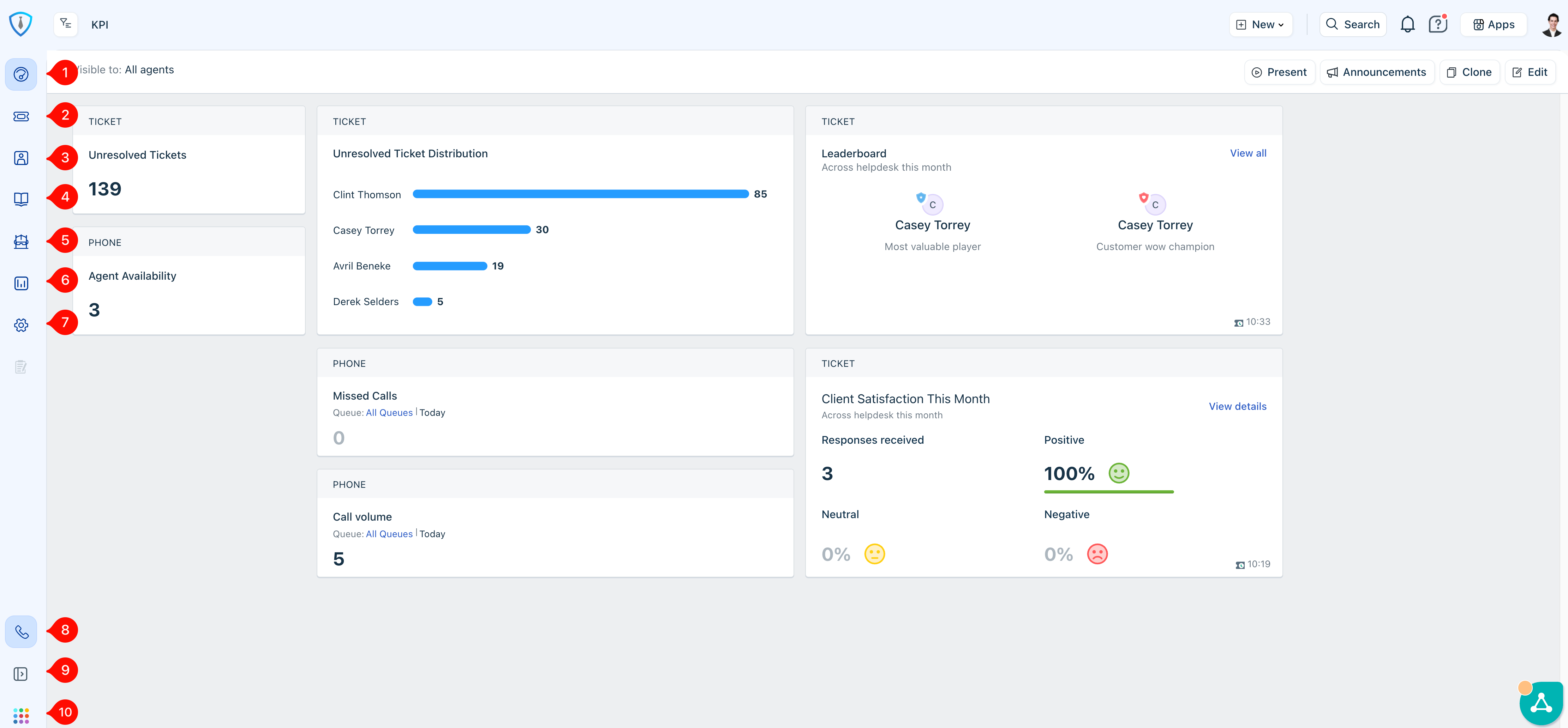 Note: If the Unresolved Ticket Distribution section is not visible on your dashboard, you may need to update your default portal view to KPI (Item 2, Figure 2).