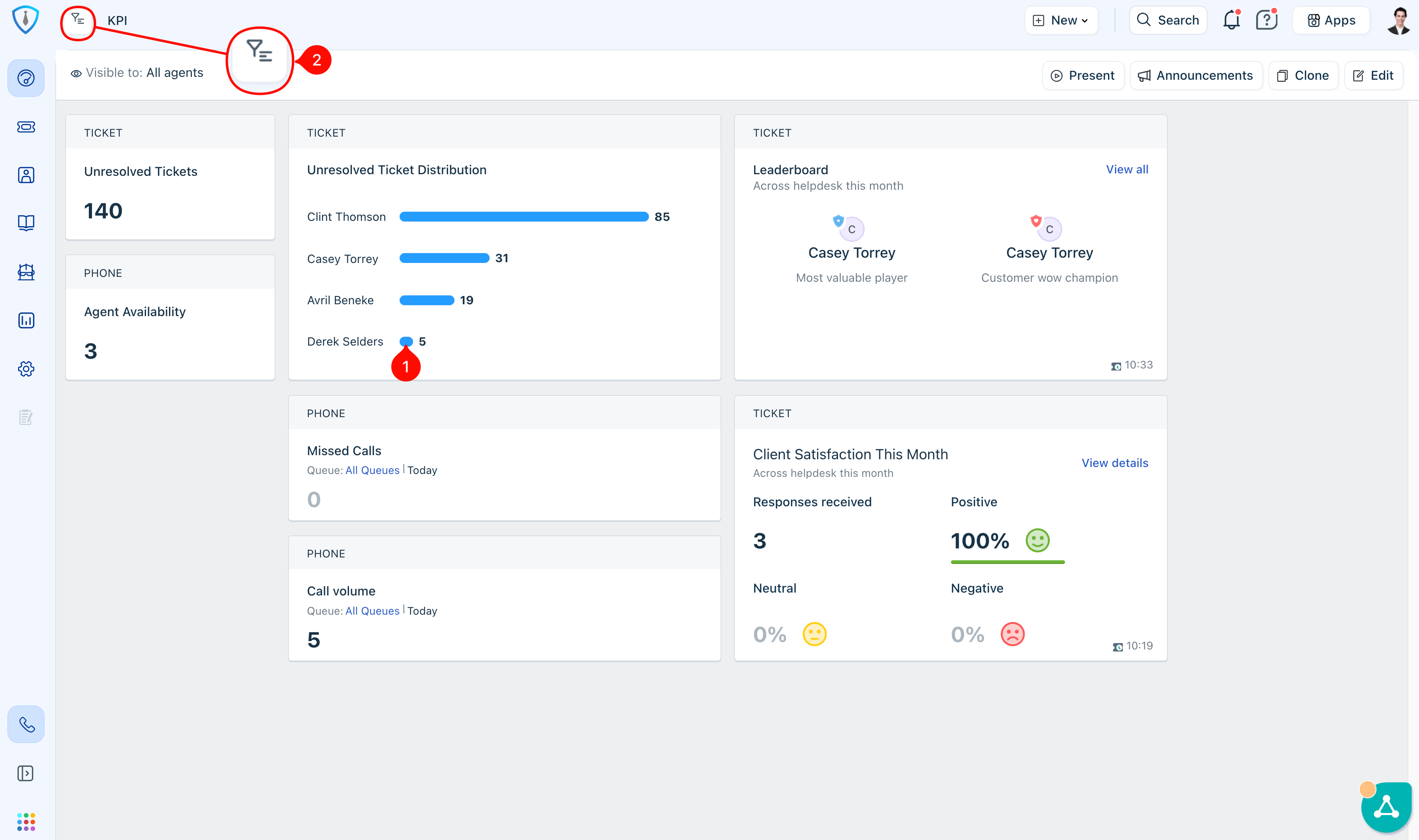 You can access your ticket queue by clicking the Tickets shortcut in the main dashboard navigation (Item 2 in Figure 1), or by selecting the bar next to your name within the Unresolved Ticket Distribution section (Item 1 in Figure 2).