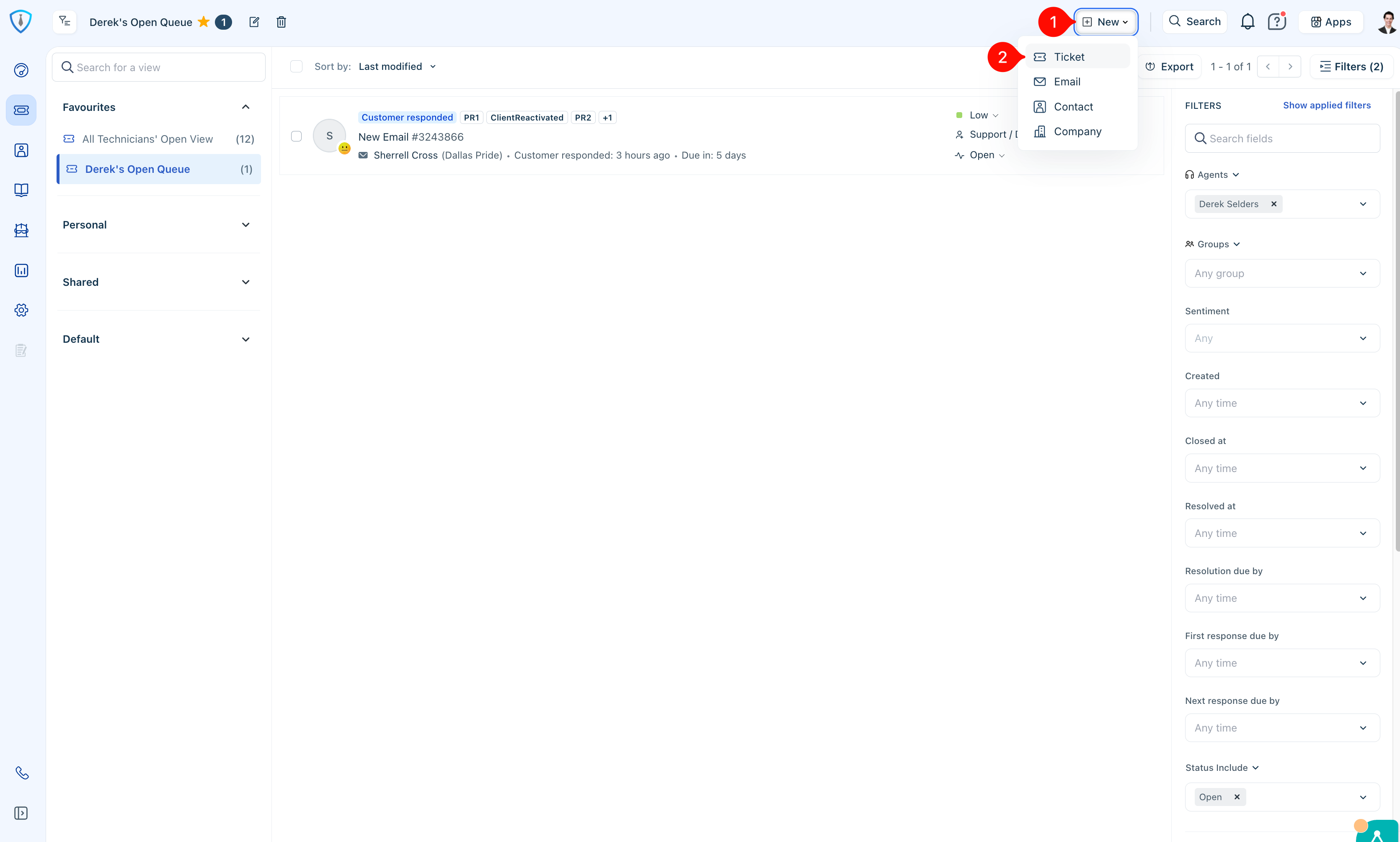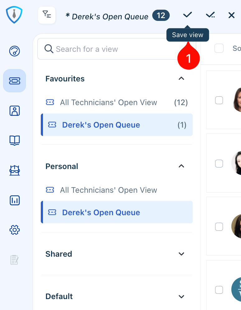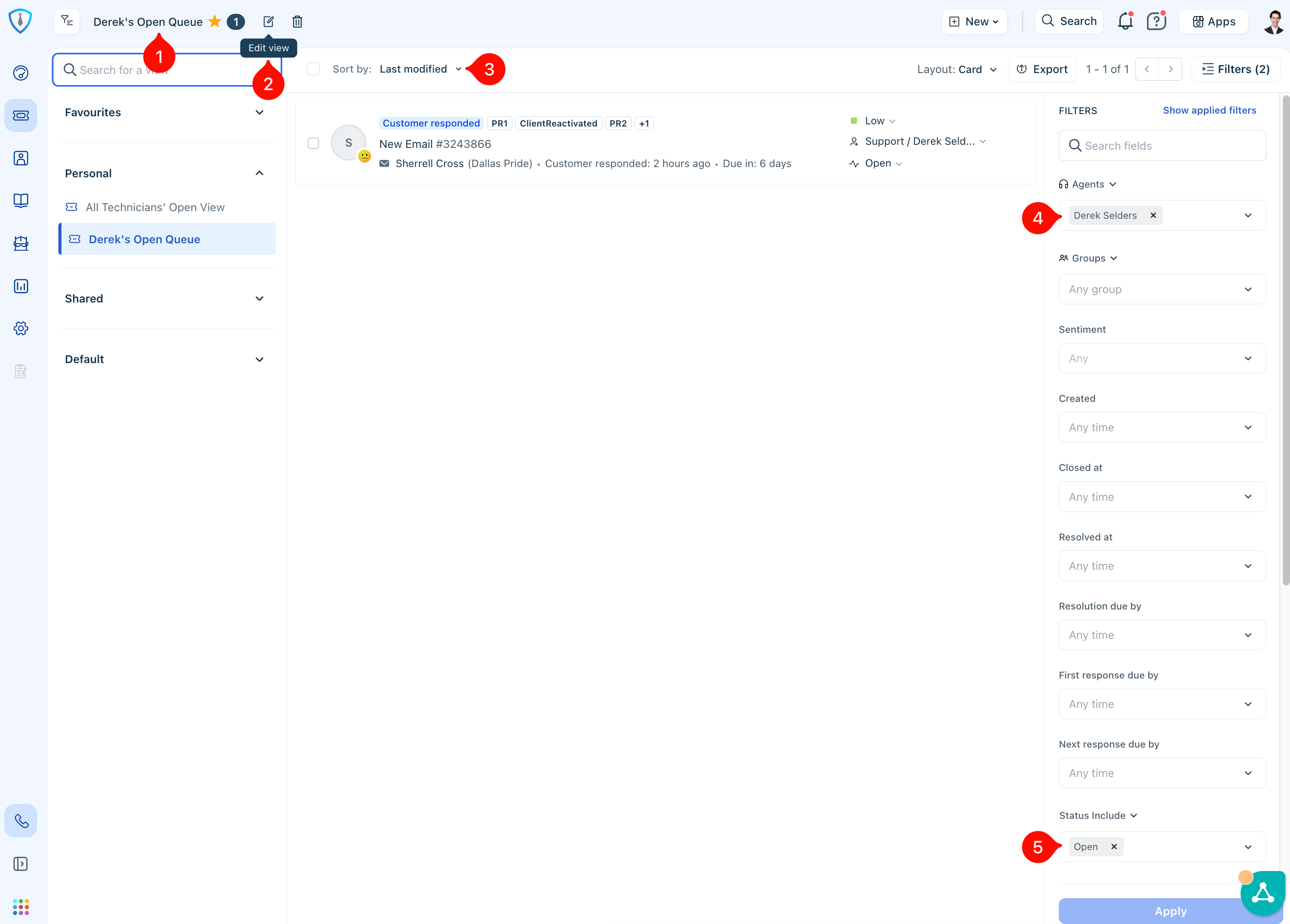 To begin, click Item 1 in Figure 3 to open the Ticket Views Panel. From there, you can select Item 2 (Edit View) if you would like to rename your Default View.