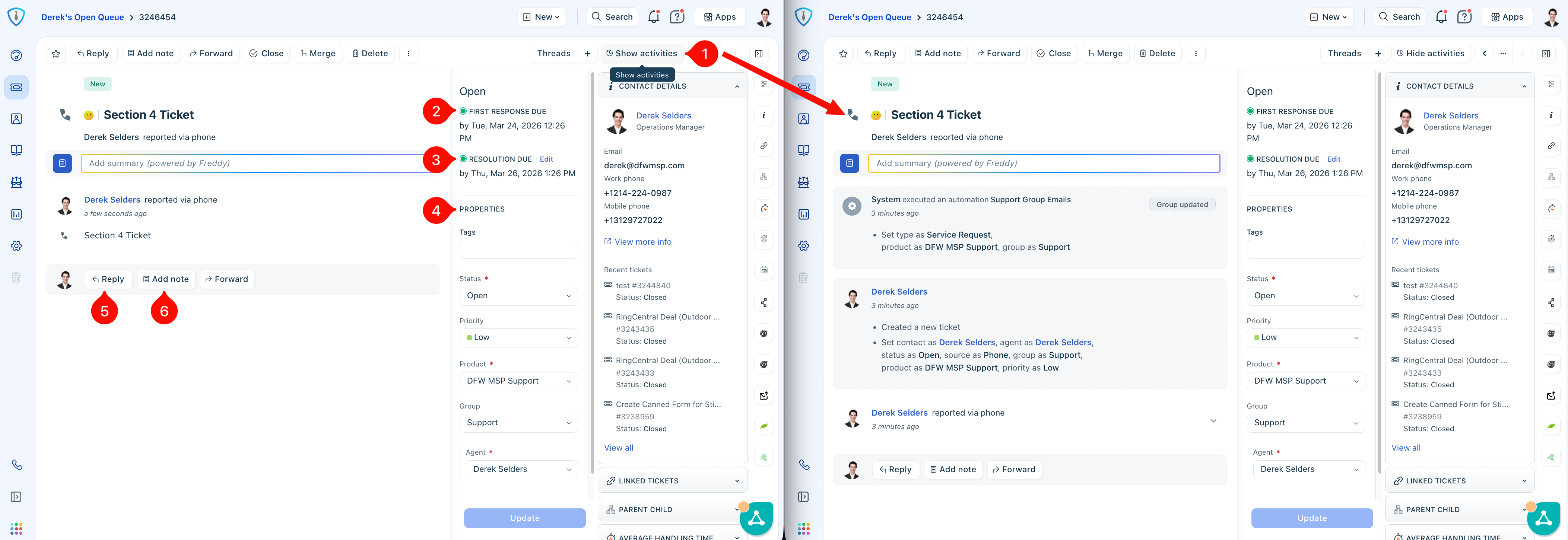 Understanding ownership and key ticket elements is essential when taking over or reviewing a ticket. The Show Activities (Item 1, Figure 7) section provides a complete history, including how the ticket was created, all status changes, documentation updates, and any automations that have been applied. This is often one of the first places you should review to quickly understand the context.