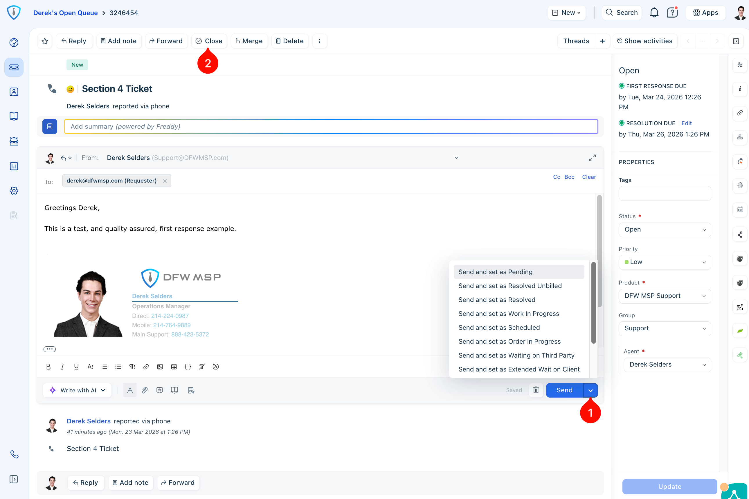 Ticket statuses can be updated from multiple locations, most commonly within the Properties section of the ticket sidebar (Item 4 in Figure 7) or at the time of sending a reply (Item 1 in Figure 8 below). Each time a status is updated, you are expected to also review and update the ticket’s resolution due date and time as needed to ensure accurate SLA tracking and reporting.