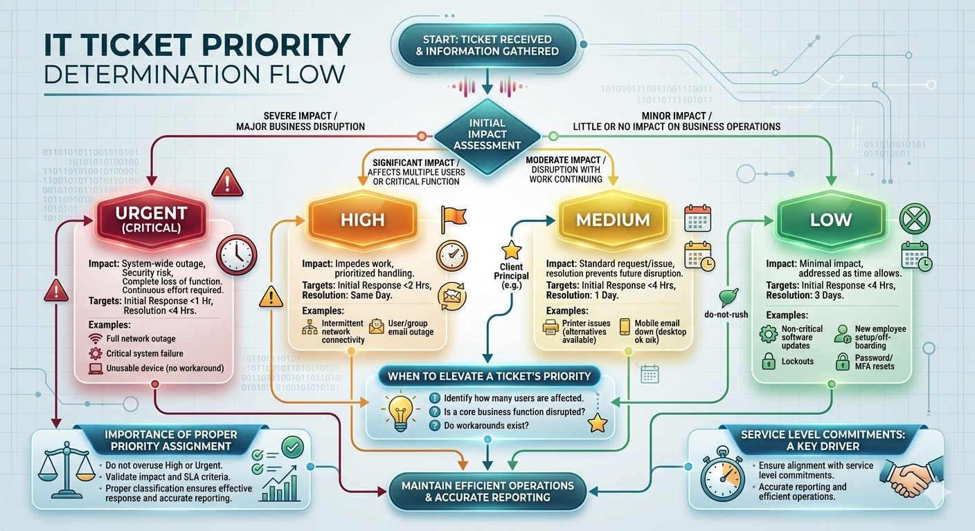 Ticket priority levels are used to define urgency, guide response expectations, and ensure alignment with our service level commitments. Selecting the correct priority is critical to maintaining efficient operations and accurate reporting.