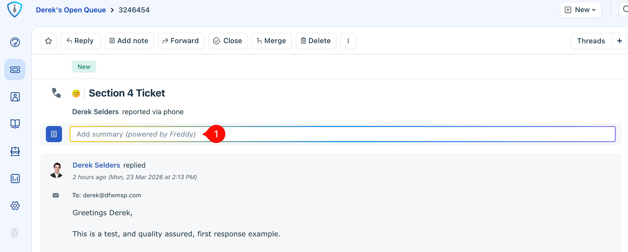 Summary notes should be added at the conclusion of a ticket to provide a clear, concise overview of the issue and its resolution. This supports reporting, future reference, and identifying patterns across similar tickets. An AI-generated summary option is available and can be used to quickly complete this step.