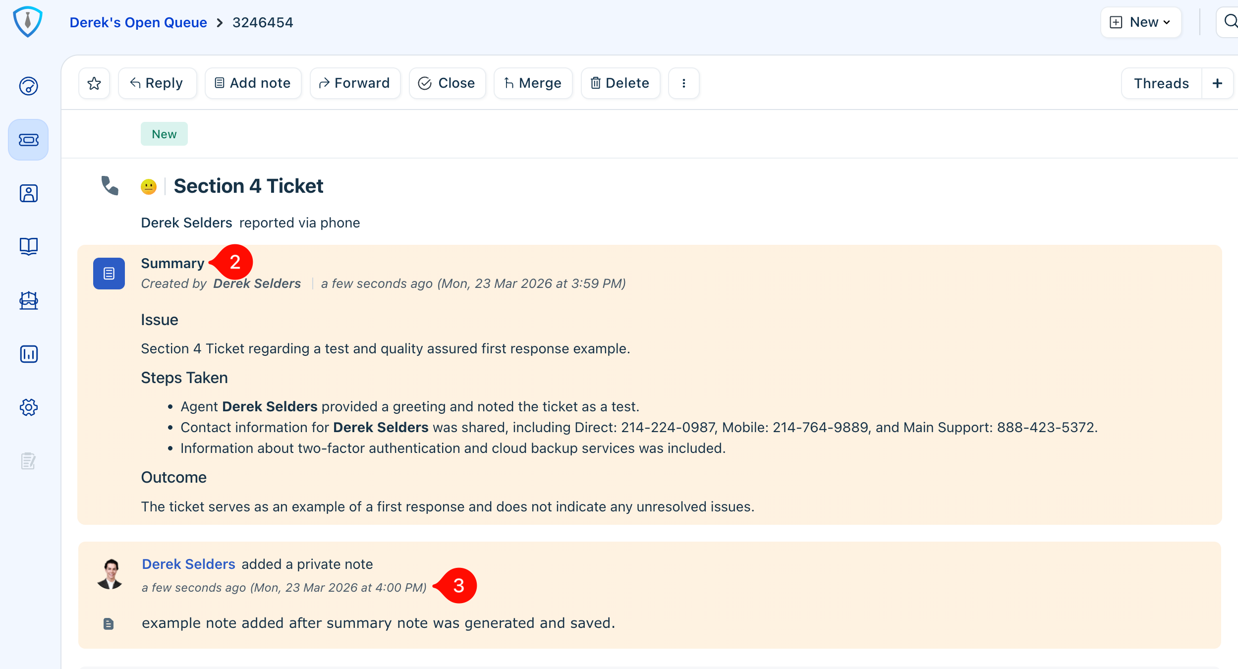 Unlike standard notes, summary notes are not part of the chronological ticket timeline and will always remain pinned at the top of the thread for easy visibility (Item 3, Figure 10). To create one, click into the Add summary field (Item 1, Figure 10), allow the summary to generate, then click save. The completed summary will then appear at the top of the ticket (Item 2, Figure 10).