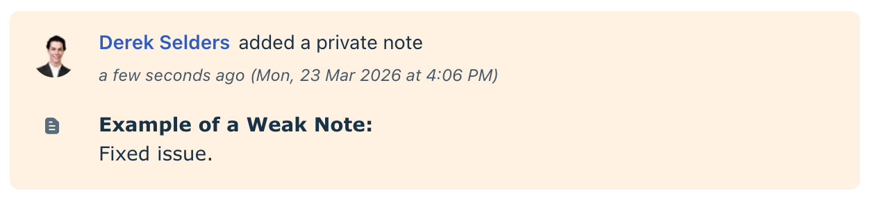 While management does not actively micromanage day-to-day activity, key operational alerts are in place. These include notifications for tickets awaiting an initial response, exceeding resolution targets, or remaining in a status for an extended period. When these thresholds are met, you may see internal notes from management to help bring attention back to those tickets.