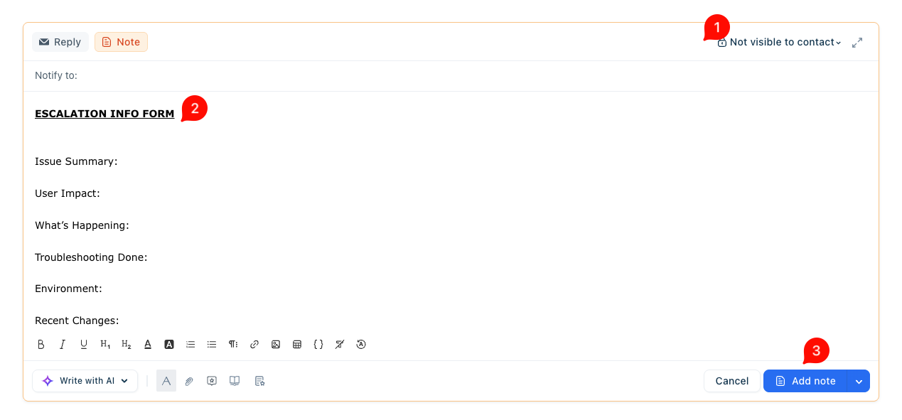 Before escalating a ticket, you must complete the Escalation Info Template by inserting the canned response into an internal, private note on the ticket. You can use the summary note for this requirement, if preferred as well.