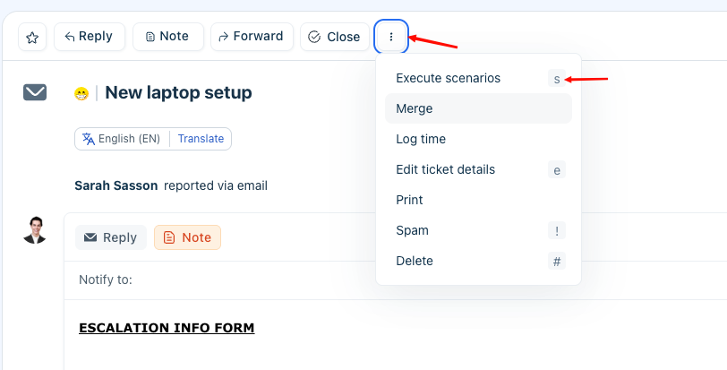 Insert the “Escalation Info Template” canned response into a private note on the ticket